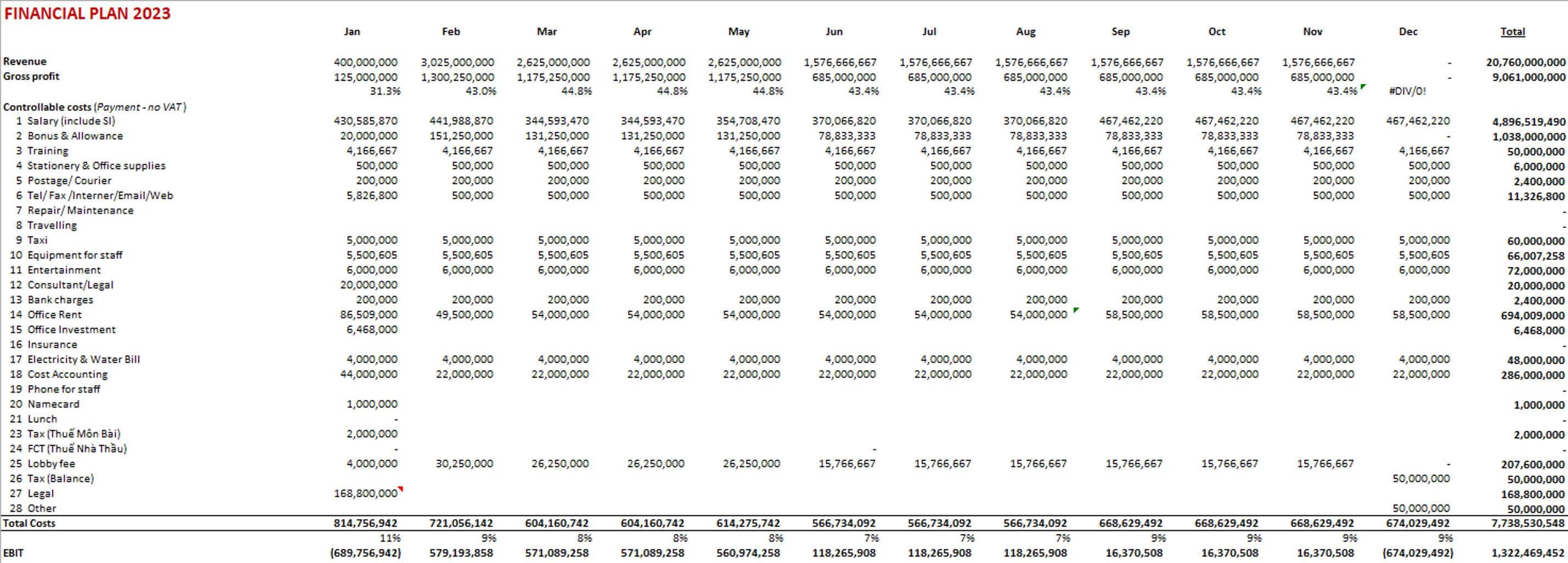 - File kế hoạch tài chính năm hoàn chỉnh, bao gồm P&L dự phóng và các chỉ tiêu tài chính quan trọng, sẵn sàng sử dụng cho quản trị và báo cáo nội bộ.